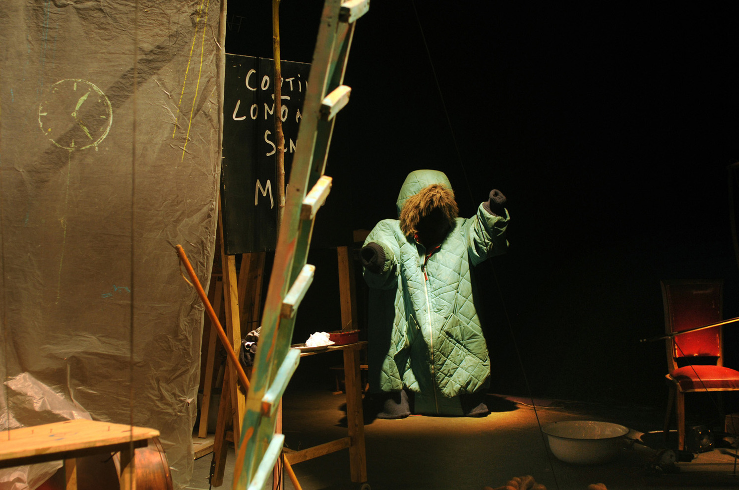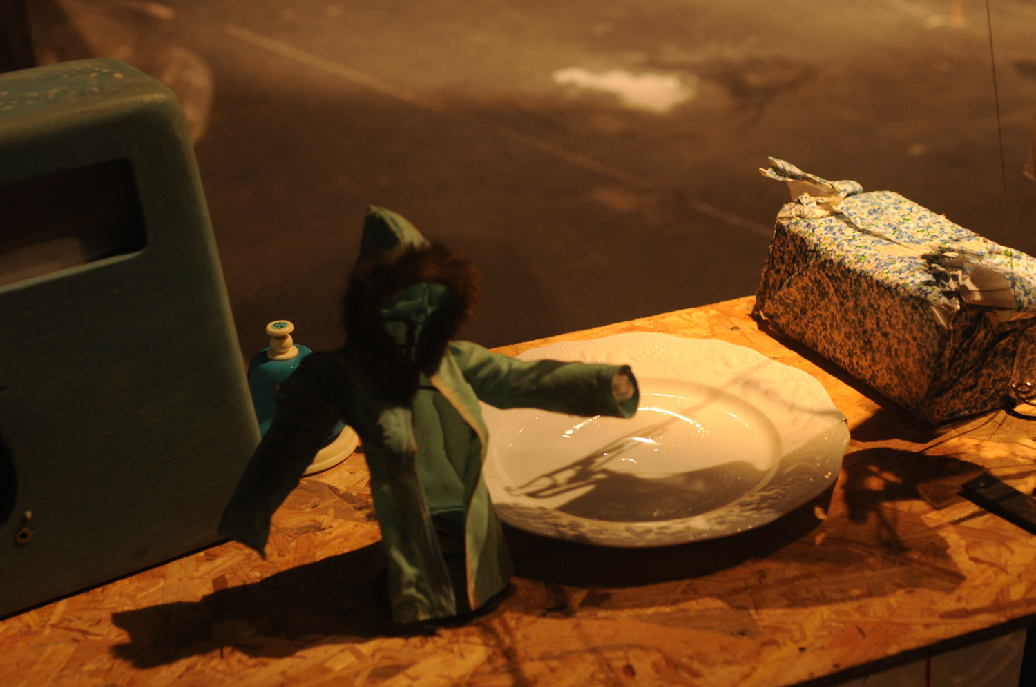 Après le spectacle, ça n’est pas terminé, une salle d’exposition nous est ouverte. Entre la visite et de courtes performances présentées, on nous sert une « boisson bleue Mahu » au goût de gingembre citronné. C’est l’occasion de scruter d’un peu plus près la texture et l’allure des objets fabriqués par la Compagnie des Ateliers du Spectacle. Au programme des festivités « post-spectacle » : La Danse du ventre, conçu et réalisé par Richard Dubelski sur un texte de Robert Pinget ; La Maladie des idées, conçu et interprété par Camille Boitel ; Les Enfants sourds, conçu et interprété par Etienne Pommeret, avec Pascale Houbin ou Anne Aïçoberry, sur un texte de Robert Pinget ; Mahu, vu ! conçu et réalisé par Anne Aïçoberry et Catherine Pavet sur un texte de Robert Pinget ; Cabane, conçu et interprété par Pascale Houbin ; Un enfant dessine, conçu et réalisé par Balthazar Daninos sur un texte de Robert Pinget. Il n’y a vraiment pas de quoi s’ennuyer au Théâtre du Fil de l’eau ces jours-ci, ne serait-ce que pour redécouvrir les textes de Pinget dans des situations scéniques qui lui vont comme un gant.