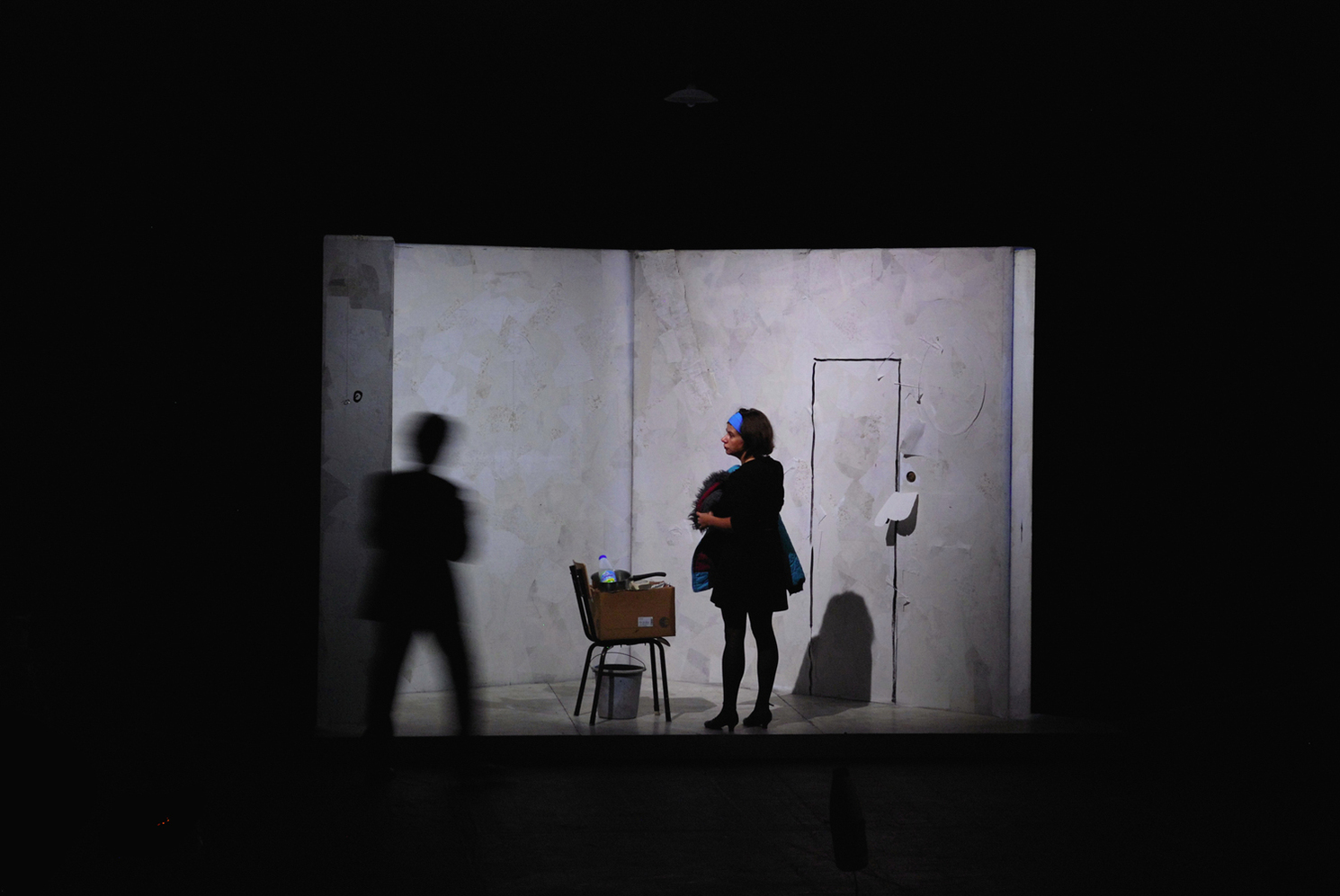 On ne peut raconter tout le spectacle, l’effet de surprise n’y serait plus… Juste un moment malgré tout, tellement extraordinaire. Un coin de pièce aux murs blancs de plâtre nu. Par magie, ce qui y est dessiné devient réalité : porte, cuisinière, vide ordures sonore, presque odorant… Dans ce lieu, la folie gagne progressivement, dans un rythme endiablé, fait de gags ; un absurde très élaboré dans sa pensée, mais qui est aussi totalement accessible. On pense à Chaplin, la farce devient énorme, mais toujours poétique en même temps. De nouveaux acteurs arrivent sur le plateau, passent, habités dans leur folie… tout cela est d’une drôlerie extraordinaire.