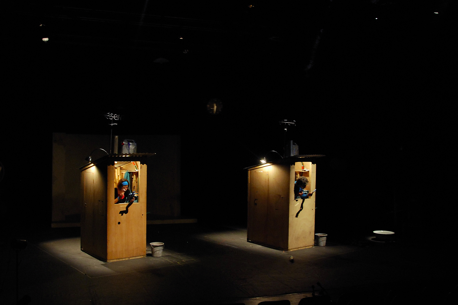 Sur la scène, deux petits chalets sont côte à côte ; l’un sous le panneau présent, l’autre futur. On s’agite dans ces cabanes : on fait chauffer du lait, on se rase, le téléphone sonne, la radio marche, l’eau coule ; derrière l’inventivité et les gags, on sent bien que ce n’est pas si drôle. Finalement, avant et après, rien ne change vraiment…. Jusqu’à ce que cela chancelle… au sens propre, les maisons ont failli s’écrouler, sous les cris de la salle… mais non, cela reste juste de guingois, permettant aux comédiens de se rencontrer, … et de tenter de parler. Mais voilà, c’est la grande affaire, cela ne sert à rien de raconter, et on va nous le démontrer. On pense à Devos, au comique des jeux de mots, qui n’ont l’air de rien, d’être du n’importe quoi, mais dont le télescopage ne se contente pas de nous faire rire ; finalement, on est d’accord, plus on cherche à raconter, plus on perd du temps, plus on reconstruit, on transforme…. moins c’est vrai, d’une certaine manière. Ainsi de l’avant et de l’après, de l’à peu près, mais aussi du flou et du net, du proche et du lointain, de ce que l’on appelle la précision, qui n’est peut être qu’un effet des jumelles et non de la réalité. Dialogues comiques d’une grande force, entre Catherine Pavet et Jean Pierre Larroche, excellents, mais aussi effets de pancartes, de démonstration par les objets qui, au fil de l’exposé, deviennent eux aussi des personnages à part entière.