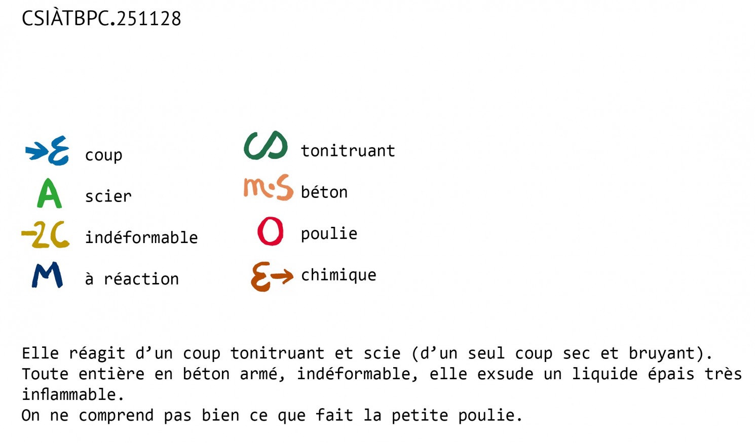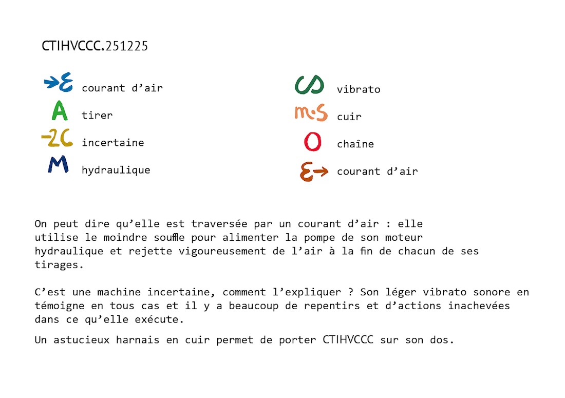 – Ce serait bien d’isoler 2 ou 3 “personnages” (la linotype, l’aspirateur, un autre?) et de leur inventer une histoire, un parcours, des questions qu’ils se posent. Ça peut être un jeu d’écriture entre nous pour commencer à tirer les fils de la suite.