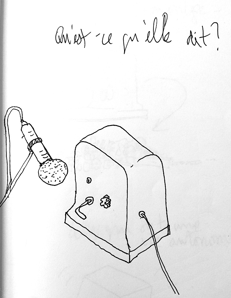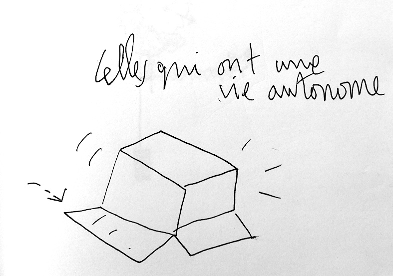 – L’idée d’un guide qui nous aide à circuler peut-être intéressante aussi. On le retrouve à différents endroits du dispositif, sous différentes formes. Un énième Mahu (mais à priori quelqu’un d’autre, même si l’épopée de Mahu en plusieurs épisodes me fait sourire aussi), une figure parfois marionnettique, parfois dessinée, parfois un simple morceau dans un coin qui parle. On a l’impression qu’il se déplace dans cet espace en changeant de forme. Cette idée me fait pensée aux furtifs de Damasio.