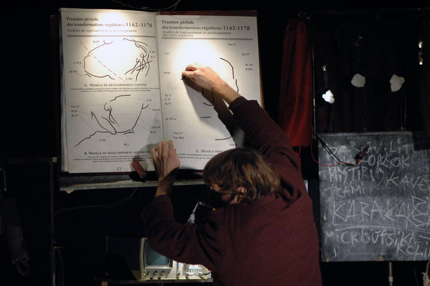 Prolixe est une sorte de cabinet de curiosité, un spectacle de 45 minutes pour une cinquantaine de spectateurs maximum. Il est interprété par deux acteurs manipulateurs et une collection de dispositifs visuels et sonores.